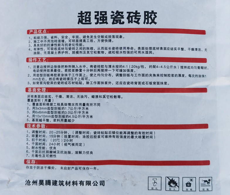 瓷磚粘合劑是無毒、無臭、無污染的環保產品。它能大幅度地提高飾面材料與基材之間的粘接強度,抗滑移,具有良好的耐水、耐酸堿及耐老化性能,能經受干濕交替及冷熱交替的考驗,徹底解決了直接用水泥粘貼的種種弊端。